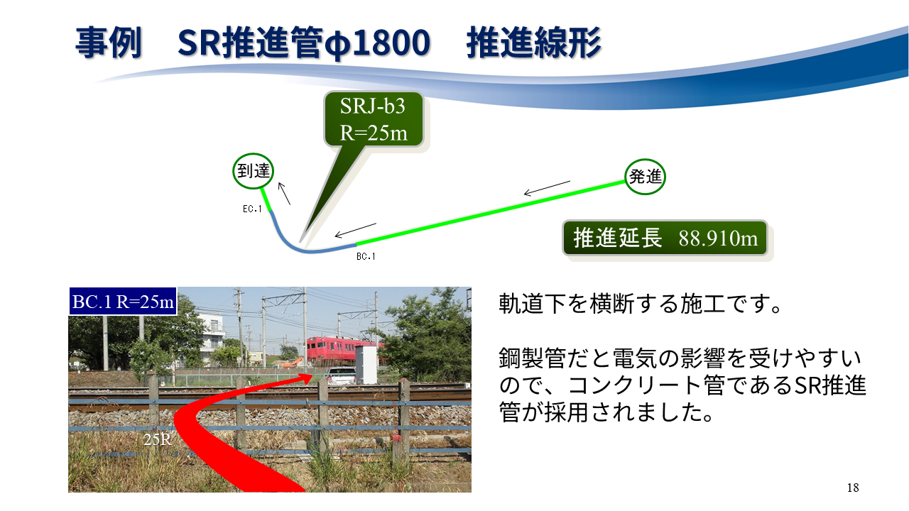 25Rの曲線で、可とう部3箇所のSR推進管φ1800を使用しました。軌道下を横断する工事で、鋼製管だと電気の影響を受けやすいため、コンクリート管であるSR推進管が採用されました。