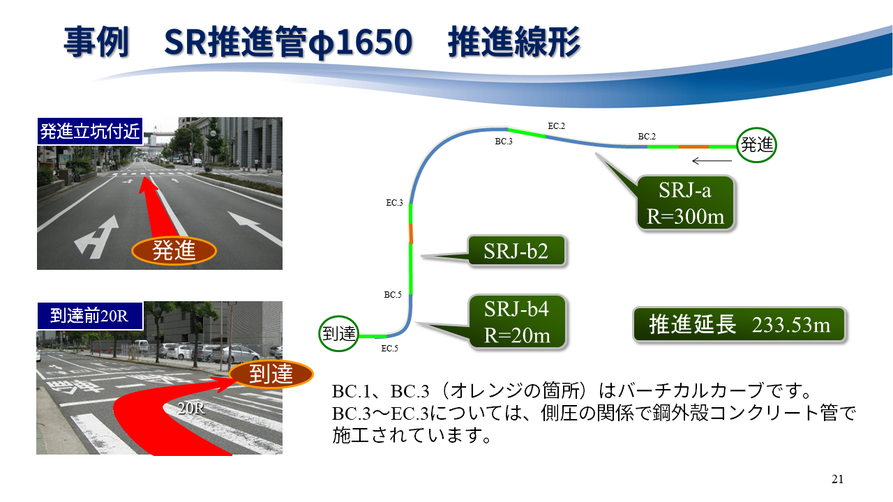 バーチカルカーブを含む最小20Rの曲線で、可とう部4箇所のSR推進管φ1650が採用されました。
